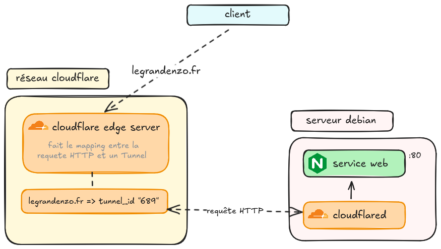 cloudflaredsur ta machine. cloudflaredouvre une connexion sortante sécurisée (HTTPS/QUIC) vers le réseau Cloudflare.- Cloudflare devient ton reverse proxy. Les utilisateurs envoient leurs requêtes à ton domaine → Cloudflare → ton tunnel → ton service local.