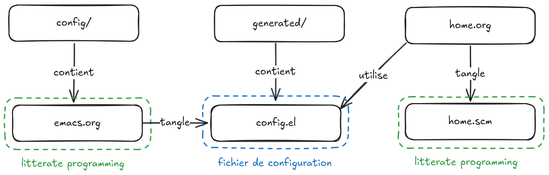 Ma configuration de mon home est entièrement en litterate programming, voici un schéma du fonctionnement de ma config :