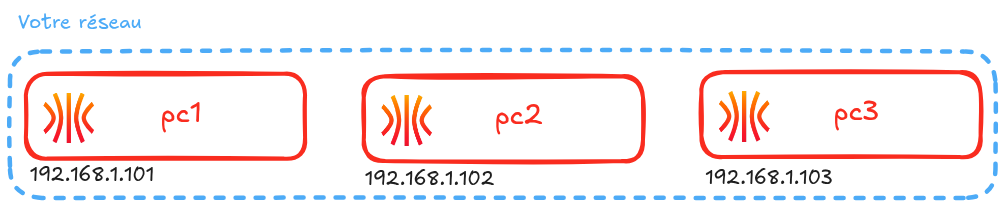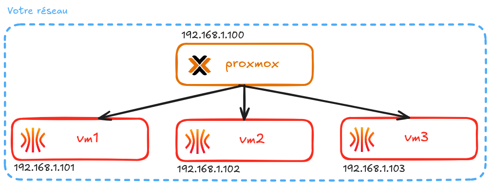 Le schéma avec Proxmox consiste à utiliser cet hyperviseur pour créer autant de machines virtuelles (VM) que nécessaire, qui serviront de noeuds dans notre cluster Kubernetes.