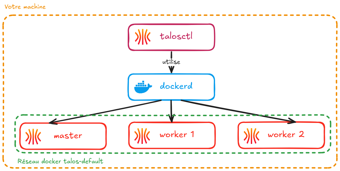 L'idée est d'utiliser l'outil en ligne de commande talosctl pour gérer des noeuds Talos Linux, et de recourir à un provider comme Docker pour créer des conteneurs exécutant Talos Linux.