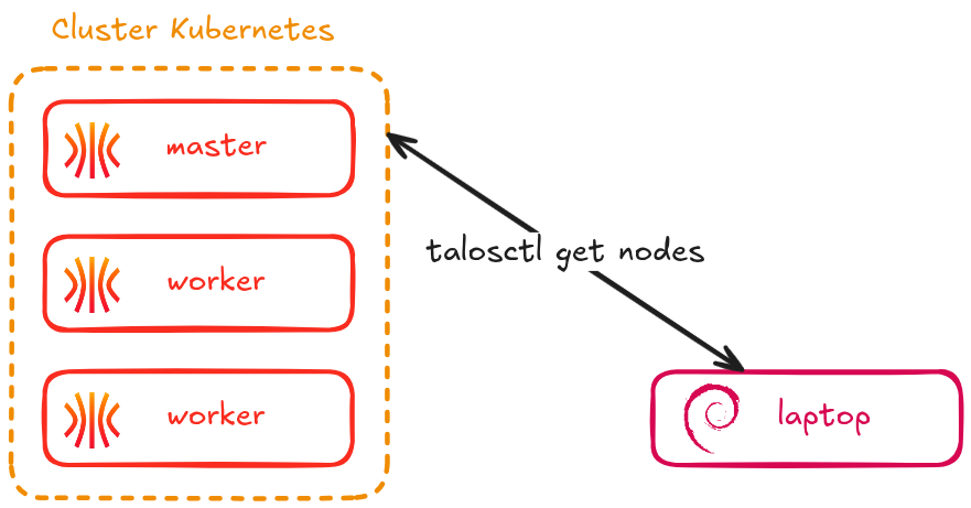 Ici, Talos Linux tourne directement sur le matériel, sans couche de virtualisation, permettant de gérer les noeuds physique via talosctl.