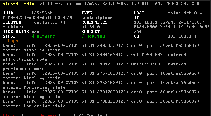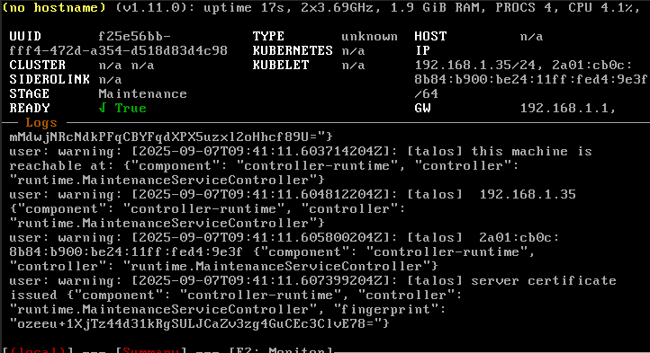 On peut voir que mon noeud à pour ip, 192.168.1.35, ça a été attribué automatiquement par le DHCP, mais il fait savoir que Talos est compatible cloud-init.